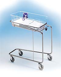 Кровать для новорожденных 381 – прекрасно сконструированное изделие ухода за новорожденными. Удобный и эргономичный дизайн и габариты кровати создают матери и медицинскому перосоналу идеальные условия для ухода новорожденными. Благодаря большим колесам кровать легко перемещается. Для ее фиксации на поверхности два колеса снабжены тормозами. Удачно расположенный кювез позволяет располагать кровать над палатной кроватью матери, что значительно облегчает доступ матери к ребенку. При этом нижняя часть каркаса pасполагается под материнской кроватью, высвобождая окружающее пространство.